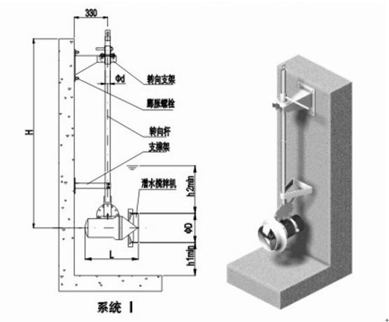 注:1、潛水?dāng)嚢铏C(jī)的專用安裝系統(tǒng),可在無需排除池中污水的情況下,能快速安裝和拆卸攪拌機(jī);