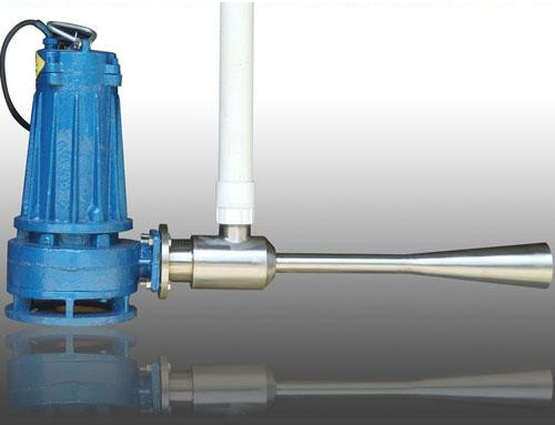 1.5 通過曝氣專用泵產(chǎn)生的水流經(jīng)過噴嘴形成高速水流,在噴嘴周圍形成負(fù)壓吸入空氣,經(jīng)混合室和水流混合,在喇叭形的擴(kuò)散管里產(chǎn)生水氣混合流,高速噴射而出,夾帶許多氣泡的水流在較大面積和深度的水域里渦旋攪拌,完成曝氣,并且其軸功率不隨潛沒深度的變化而變化,進(jìn)氣量可以調(diào)節(jié)。射流式潛水曝氣機(jī)可以在水位變化較大的池中應(yīng)用。